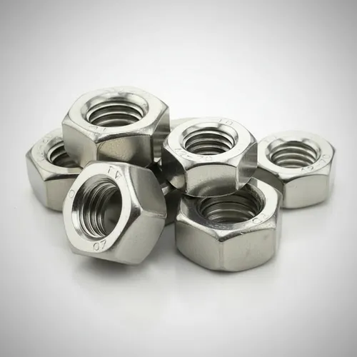 Tuerca hexagonal estándar de seis lados, diseñada para apretarse con herramientas.