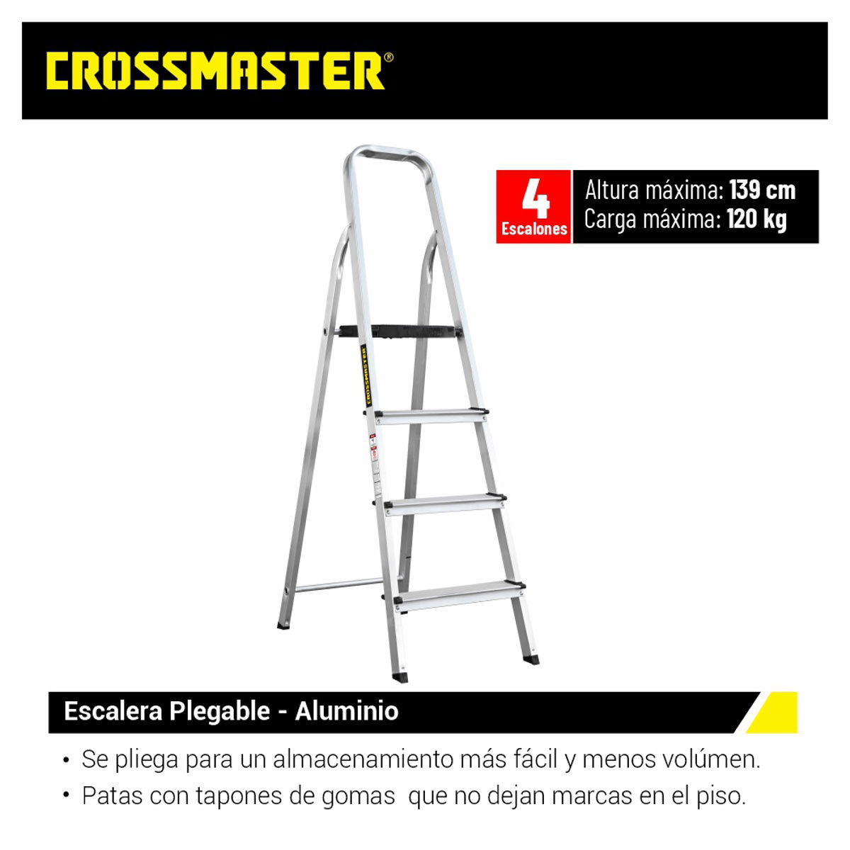 Toma Principal (Escala Real): Muestra la escalera desplegada. Al tener 4 escalones, alcanza una altura máxima de 139 cm, ideal para tareas domésticas estándar como cambiar lámparas o alcanzar estantes altos de forma cómoda.