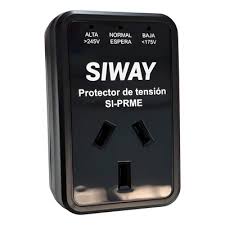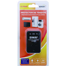 El producto en la imagen es un Protector de Tensión SIWAY SI-PRME, diseñado para proteger electrodomésticos de hasta 2200W (10A) contra picos de voltaje y cortes de luz.